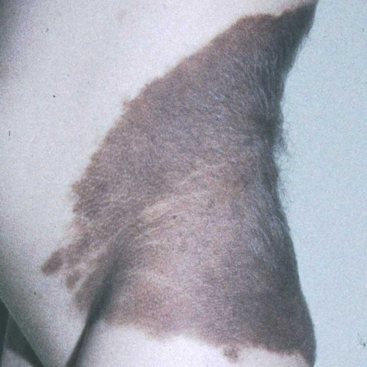 Kongenitální "plavkový" névus - pigmentová léze přítomná již od narození. Jsou nutné pravidelné kontroly u dermatologa alespoň 1x ročně.